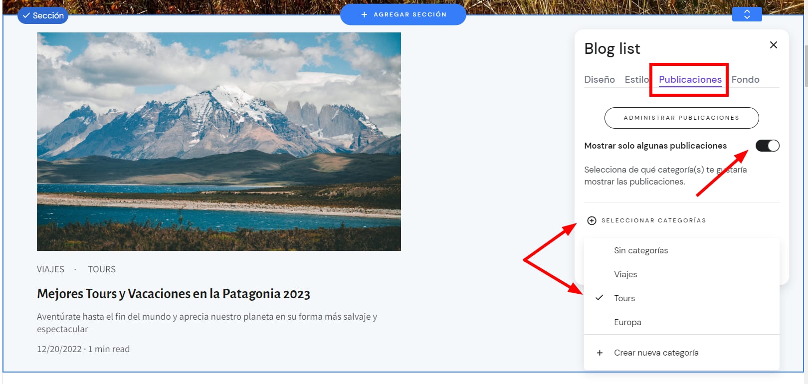 3. En la pestaña Publicaciones, habilita la opción Mostrar solo algunas publicaciones. Luego, haz clic en Seleccionar categorías y elija qué publicaciones, por categoría, mostrar en una sección de blog en particular: