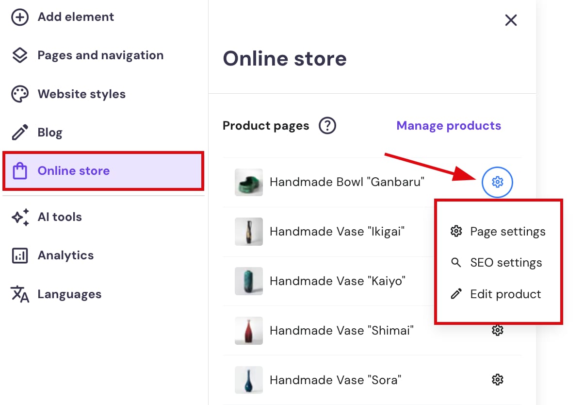 Dentro del constructor, despliega el panel Tienda online de la izquierda. Busca la página del producto en cuestión y haz clic en la rueda de configuración para ver más opciones: