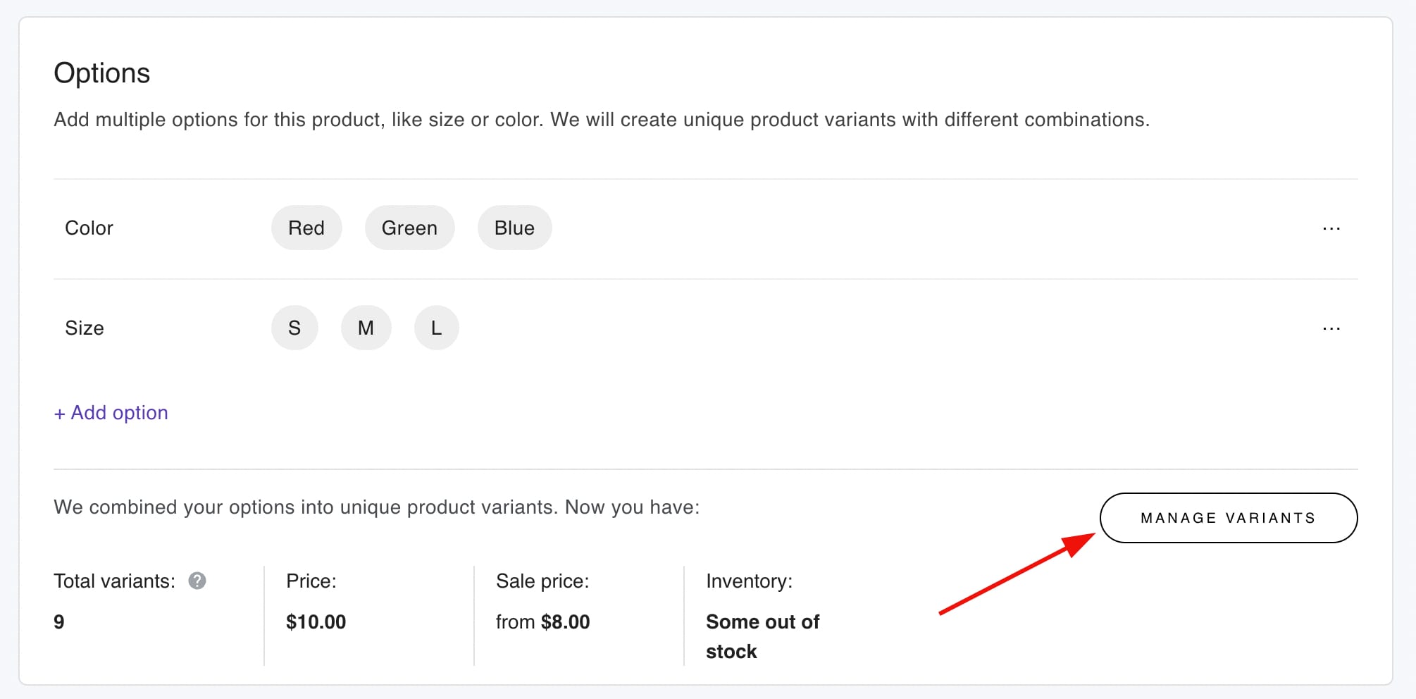 3. Haga clic en Gestionar variantes para especificar los detalles (imagen, precio, precio de venta, SKU, peso, cantidad de existencias) de cada variante de producto individualmente: