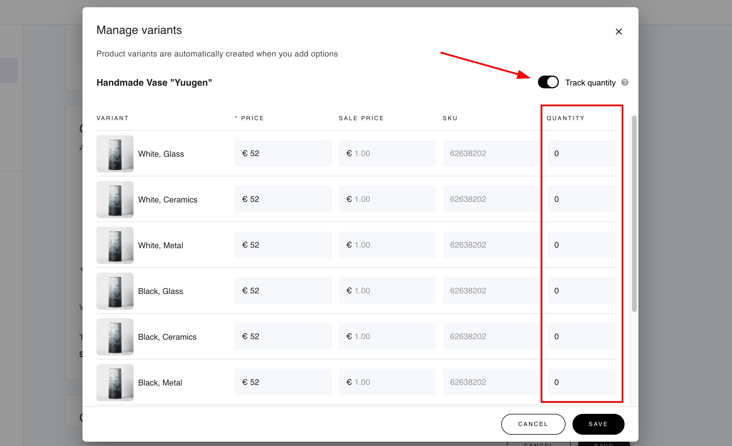 En tu área de gestión de la tienda, ve a Productos y haz clic en un producto que quieras editar. En la configuración del producto, desplázate un poco hacia abajo y activa el botón Seguir cantidad para activar el seguimiento de inventario. A continuación, especifica la cantidad de existencias: