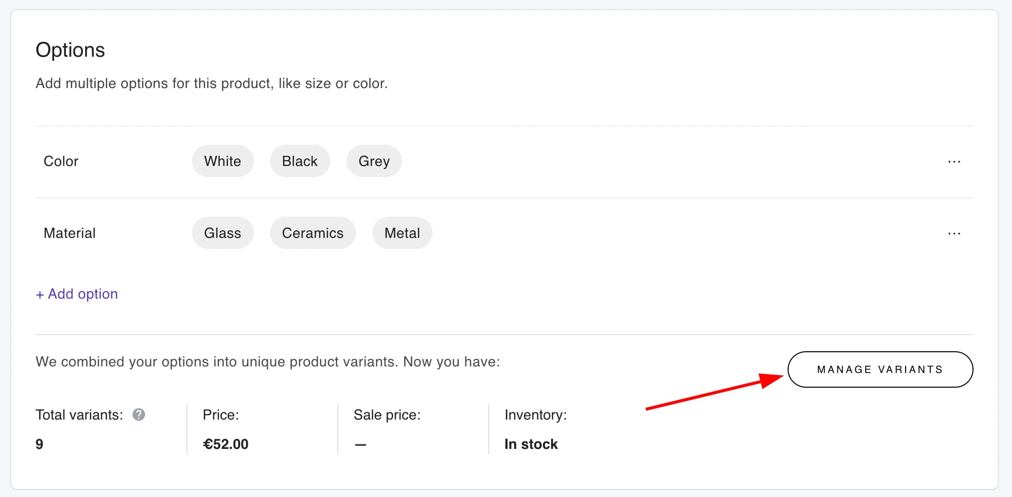 También puede especificar el stock para cada opción de producto individualmente. Haga clic en Gestionar variantes:
