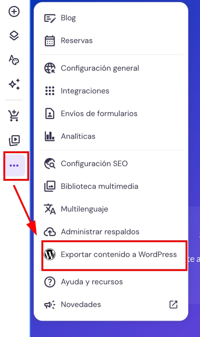 Luego, dentro del generador, haz clic en el botón de puntos suspensivos ⋯ en la barra lateral para abrir los ajustes y seleccionar Exportar contenido a WordPress: