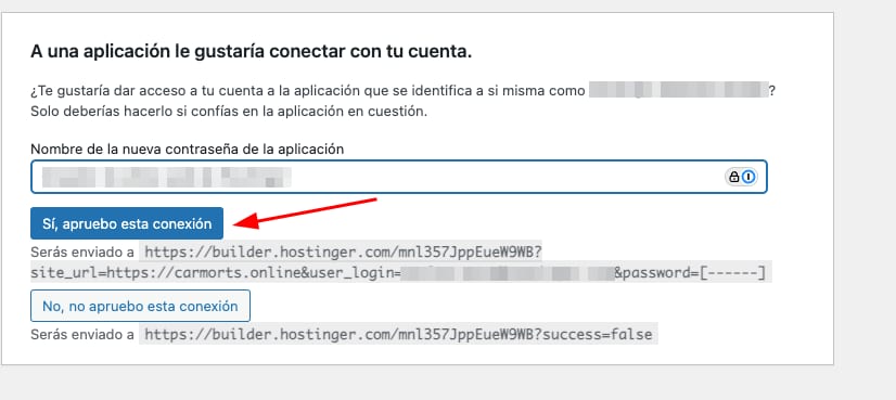 Se te redigirá al panel de administración de WordPress, donde deberás crear una nueva contraseña para la aplicación. Esta contraseña se usará únicamente para la aplicación de exportación de contenido. Una vez hecho esto, haz clic en Sí, apruebo esta conexión: