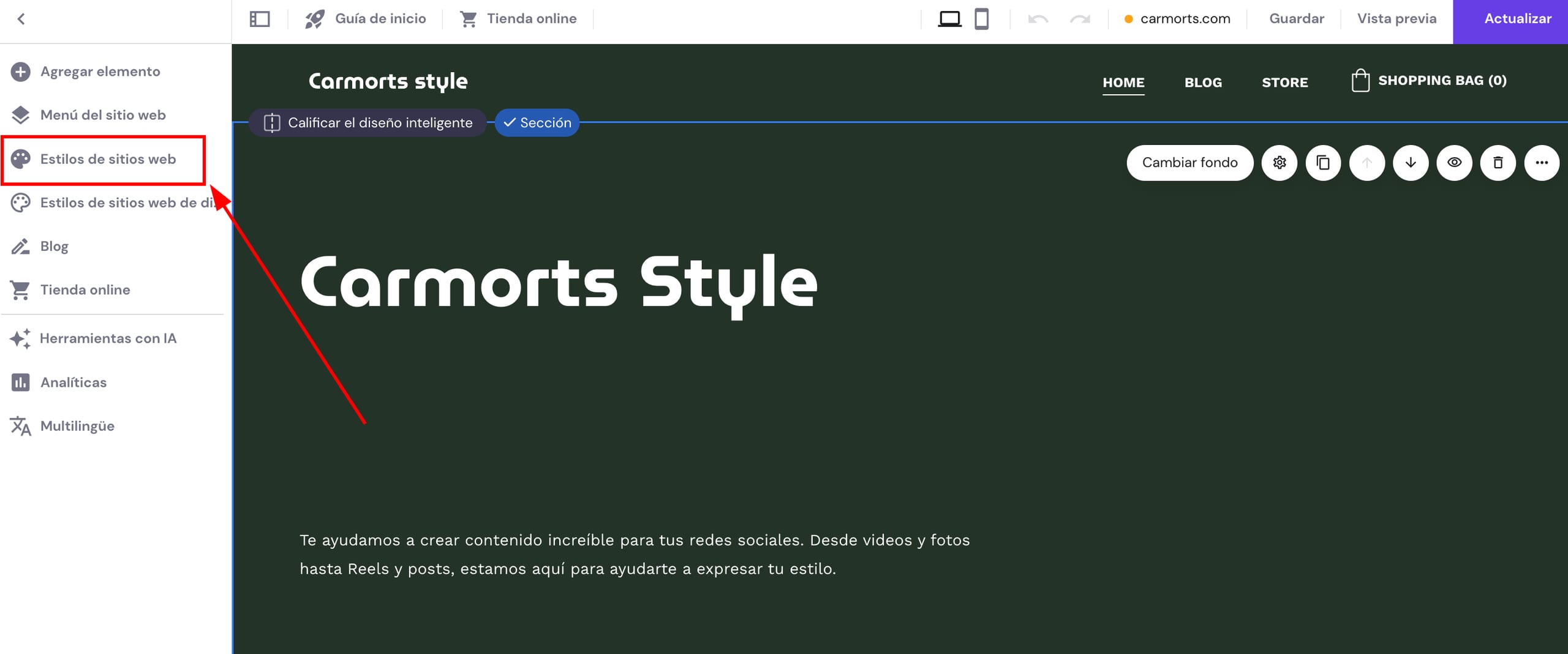 Dentro del creador, expande el panel Estilos de sitios web a la izquierda:
