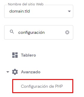 Ve a Sitios web → Administrar en tu hPanel, busca Configuración de PHP en la barra lateral y haz clic: