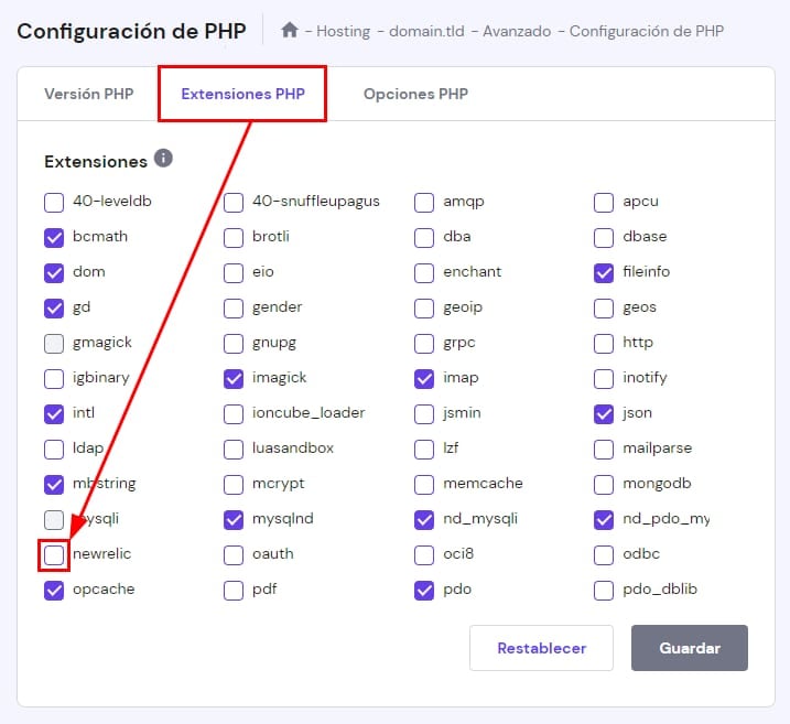 A continuación, haz clic en la pestaña Extensiones de PHP, desplázate hacia abajo para encontrar newrelic y haz clic en la casilla de verificación para habilitar:
