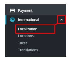 Puedes configurar el idioma de tu tienda en línea PrestaShop descargando y aplicando el paquete de localización correspondiente. Ve a tu Panel de Administrador de PrestaShop, desplázate hacia abajo en la barra lateral y haz clic en Internacional → Localización: