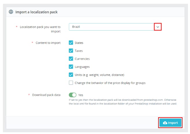 A continuación, selecciona tu país de la lista y marca las casillas de la información que deseas que use tu tienda, como estados, impuestos, moneda e idioma. Una vez que esté listo, haz clic en Importar: