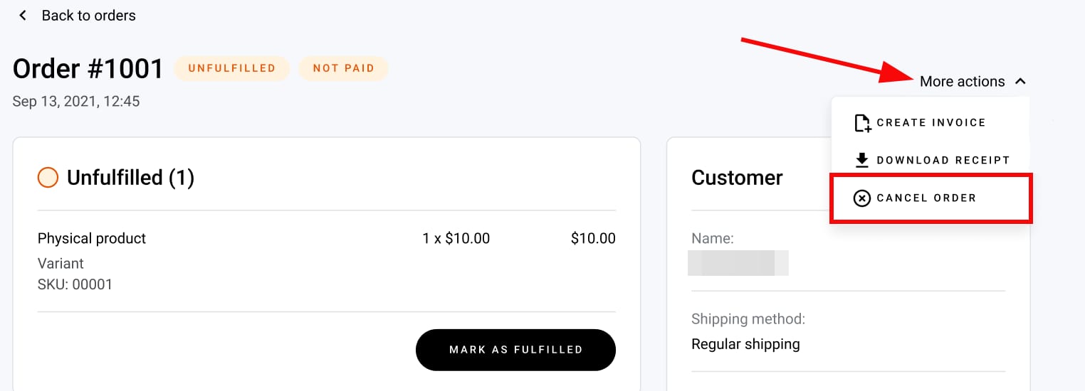 A continuación, busca el desplegable Más acciones en la parte superior derecha y haz clic en Cancelar pedido: