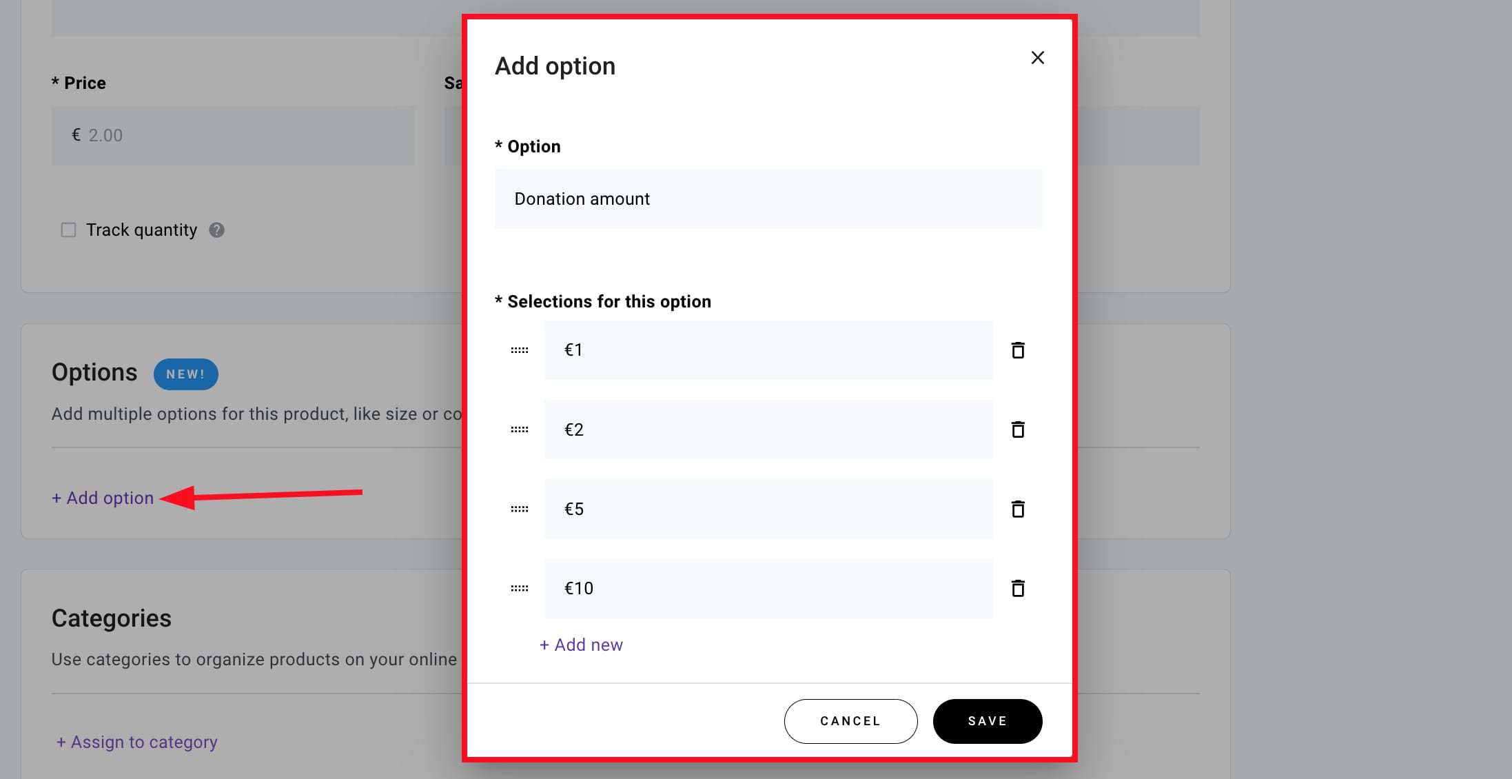 (Opcional) Agrega opciones de producto para permitir a los usuarios seleccionar el monto de la donación, por ejemplo, 1 €, 2 €, 5 €, etc.: