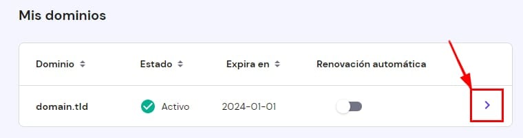 La lista Mis dominios muestra el nombre del dominio, el estado, la fecha de vencimiento y el estado de renovación automática. Para abrir la página de administración de un dominio, haz clic en la flecha ❯: