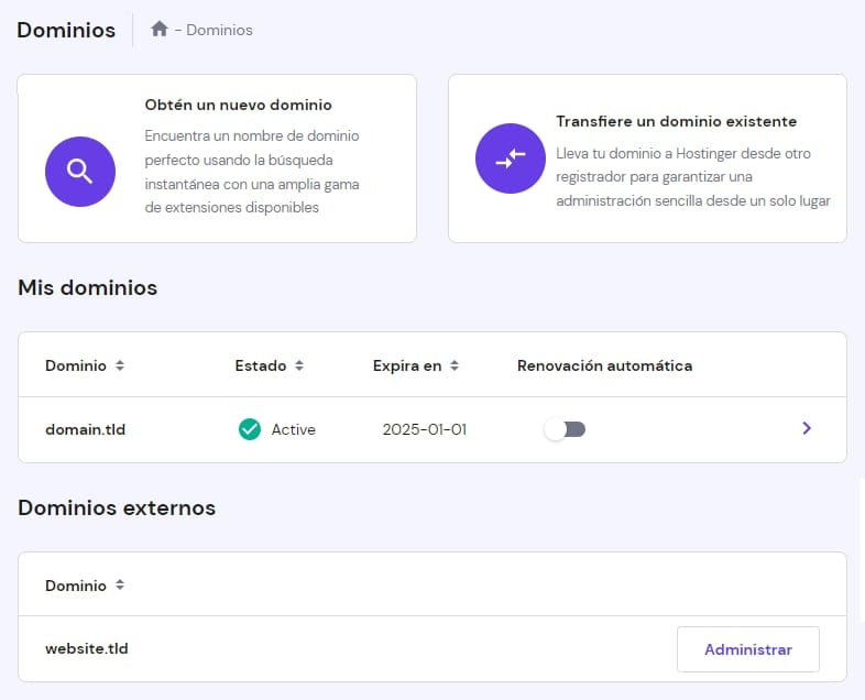 Si has agregado un dominio comprado en otro proveedor en tu plan de hosting, lo encontrarás en la lista de Dominios externos, donde tendrás la opción de transferirlo a Hostinger. Para los dominios que apuntan a Hostinger por servidores de nombres, también encontrarás un botón para acceder a la Zona DNS activa y administrar los registros del dominio.