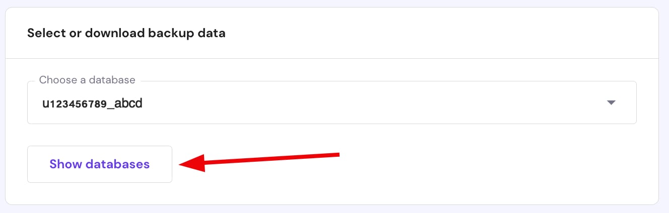 Un proceso similar se aplica cuando se descargan bases de datos generadas – seleccione Copias de seguridad de bases de datos. En el menú desplegable, seleccione su base de datos y haga clic en Mostrar bases de datos: