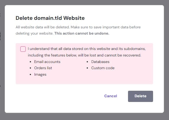 El siguiente paso es eliminar el sitio web original de tu plan de alojamiento. De lo contrario, no podrás utilizar tu nombre de dominio con otro plan de alojamiento.