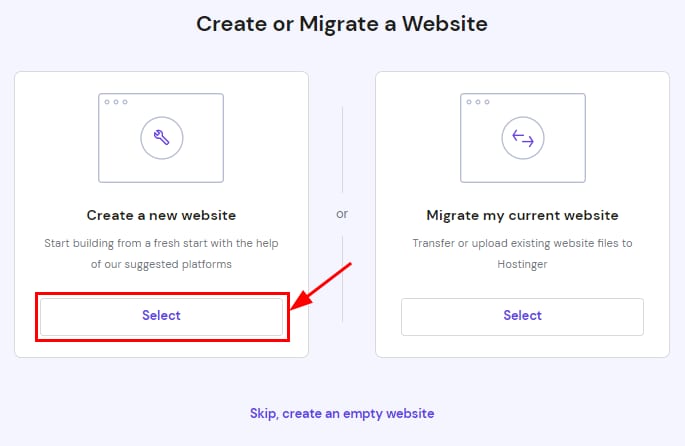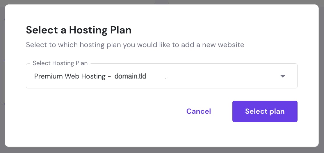 En hPanel, vae a Sitios web, haga clic en Crear o migrar un sitio web, seleccione el plan de alojamiento preferido y haz clic en Seleccionar plan: