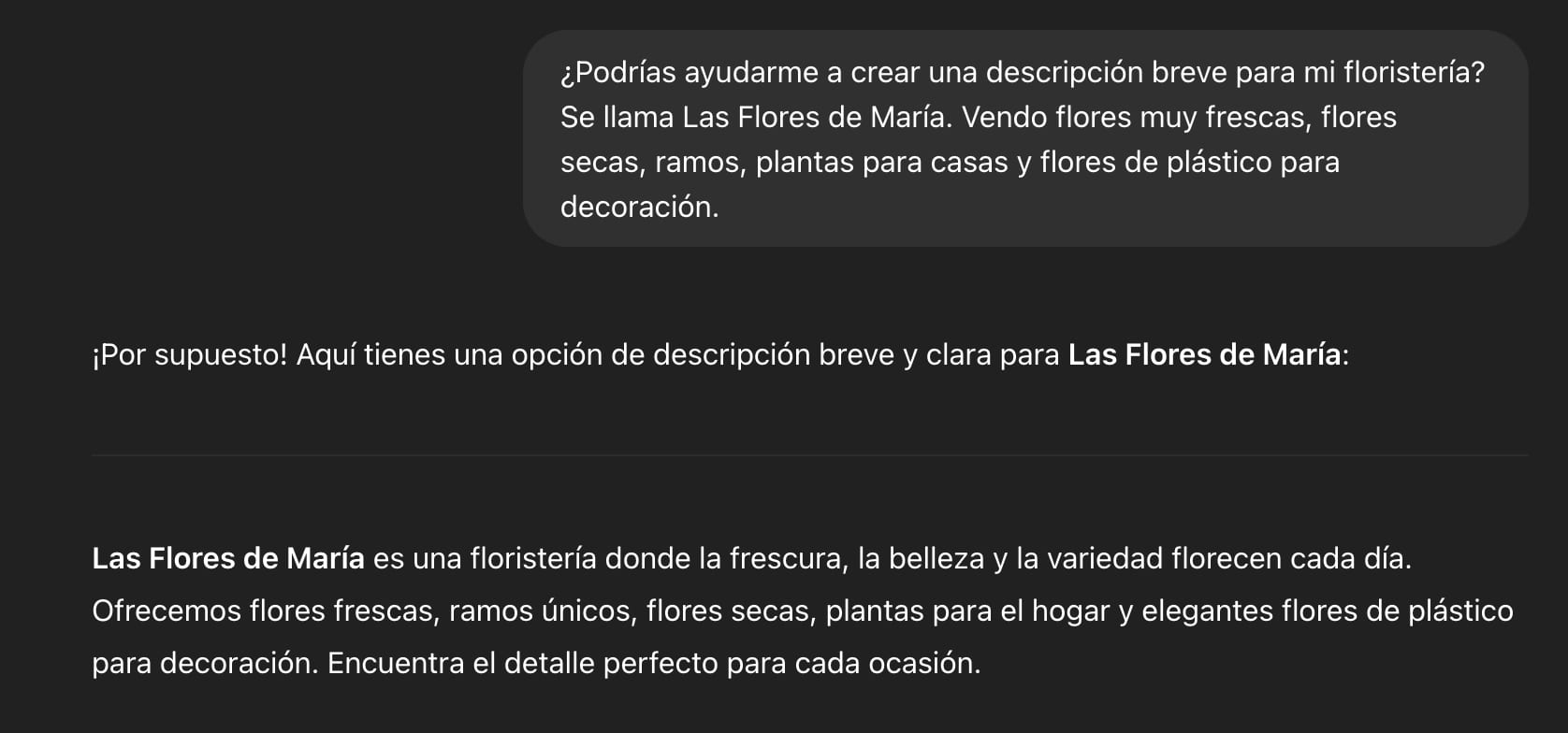 Describe en pocas palabras de qué trata tu negocio o marca. Nuestra IA usará esa información para generar contenido original adaptado especialmente para ti. Cuanto más detallada sea la descripcion, mejores serán los resultados. Y si te cuesta crear una descripción breve, también puedes usar ChatGPT: