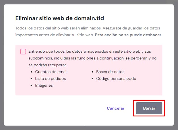 Finalmente, confirma la acción al marcar la casilla de verificación y luego, da clic en Borrar. De esta manera, tu sitio web será eliminado del plan de hosting.