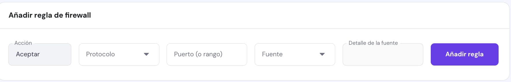 Los grupos de firewall de VPS de Hostinger requieren que al menos una regla se active. Un conjunto de reglas vacío bloqueará todo el tráfico cuando se aplique a un servidor. De forma predeterminada, el firewall de VPS de Hostinger descarta todo el tráfico, lo que significa que debes añadir reglas de aceptación para todos los puertos que quieras usar.