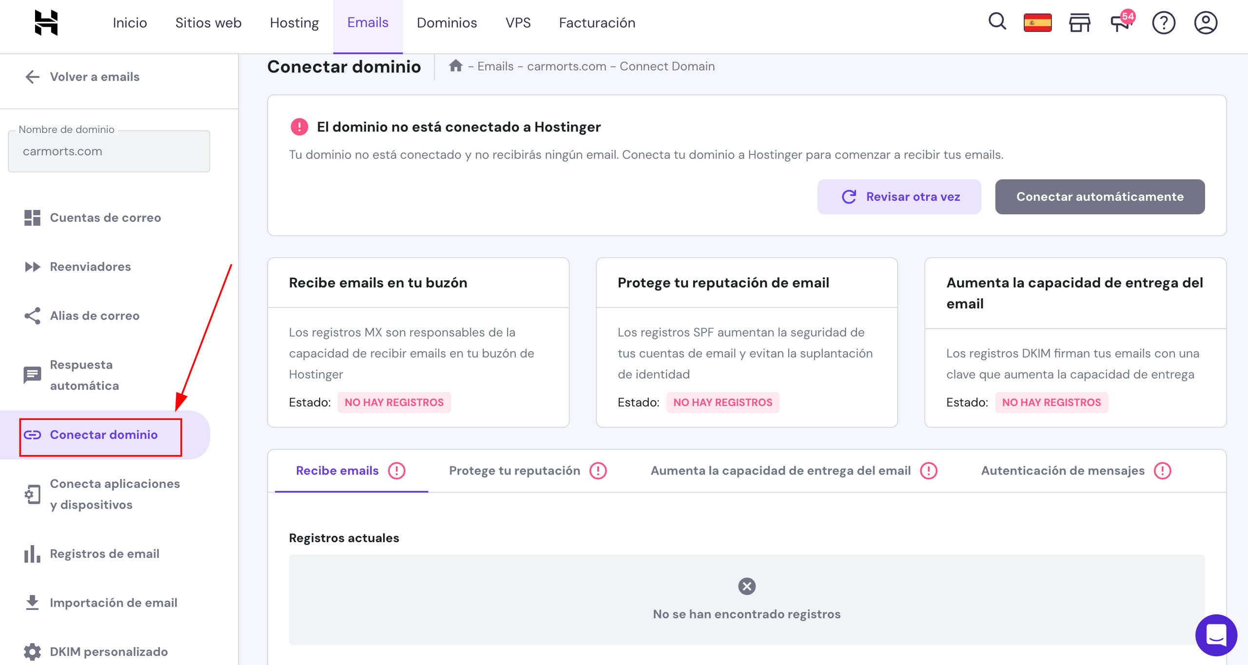 Si tu dominio no está conectado a Hostinger mediante servidores de nombres (.es decir, utiliza nameservers distintos de ns1.dns-parking.com y ns2.dns-parking.com), deberás configurar el dominio para el Email de Hostinger manualmente.👇
