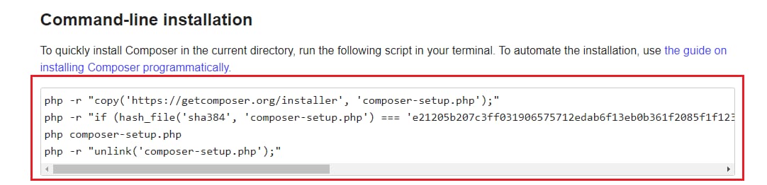 3. Una vez en la carpeta de tu proyecto, ve a la documentación oficial de descarga de Composer. Encuentra esta sección: