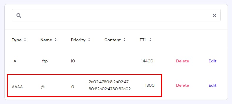Desplázate o usa la barra de búsqueda para encontrar cualquier registro AAAA existente: