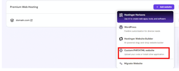 - En hPanel, ve a Sitios web, busca el plan de hosting preferido, haz clic en Añadir sitio web y selecciona Sitio web con PHP/HTML personalizado como la plataforma preferida.