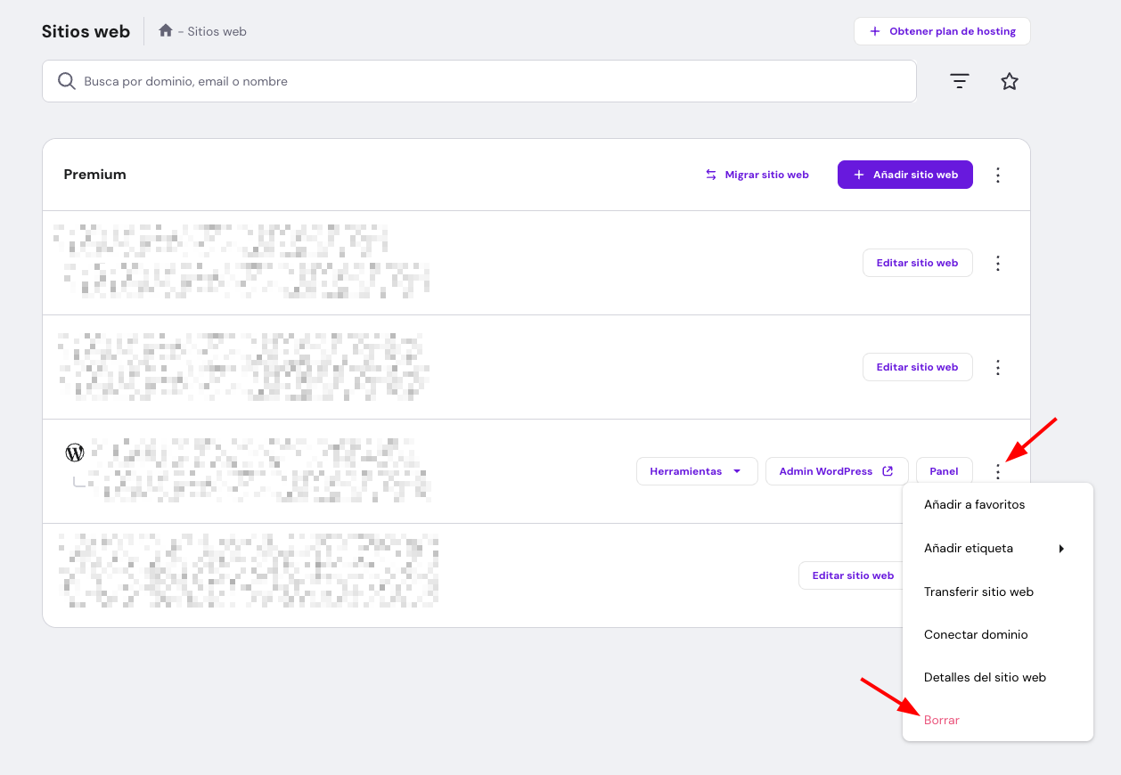 - En hPanel, ve a Sitios web, busca el sitio web en cuestión, haz clic en el botón de los puntos suspensivos ⋯ y selecciona Eliminar: