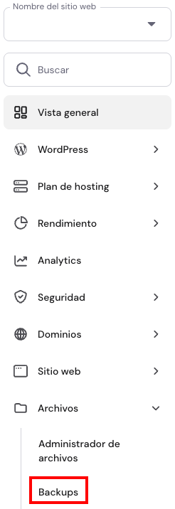 - En hPanel, ve a Sitios web y haz clic en Panel de control junto al sitio web en cuestión. Luego, en el menú lateral izquierdo, busca Backups y haz clic.