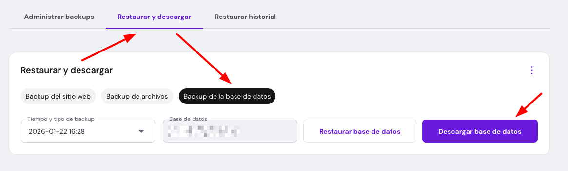 Un proceso similar se aplica al descargar bases de datos generadas: selecciona Backups de bases de datos. Selecciona la base de datos de tu sitio web y la fecha del backup, luego haz clic en Descargar base de datos: