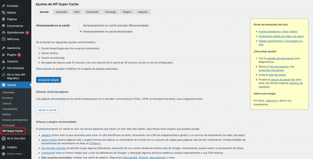 WP Super Cache modifica el sistema de caché de tu sitio de WordPress utilizando tres modos de caché: Caché WP, Simple y Experto.