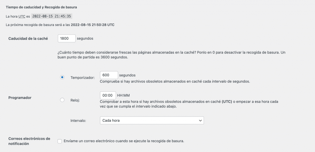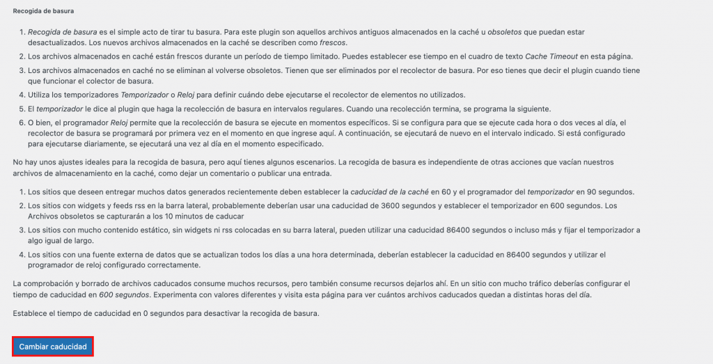 - Si quieres desactivar la recolección de basura, simplemente establece el tiempo de espera de la caché en 0 segundos.
