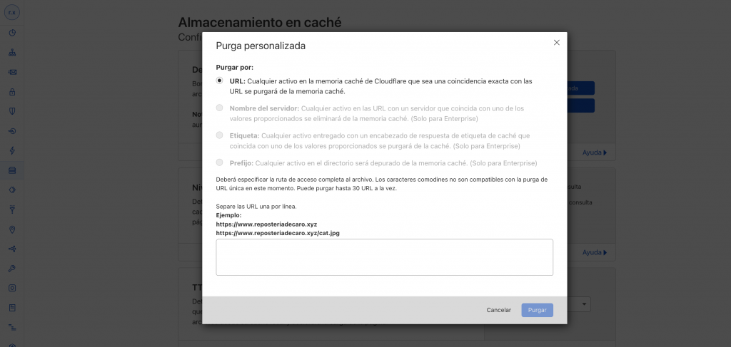 - Elige el método que prefieras para borrar la caché. Para borrar todos los archivos de la caché, haz clic en el botón Purgar todo. Si quieres seleccionar páginas específicas, elige Purga personalizada y rellena las páginas que quieres purgar.