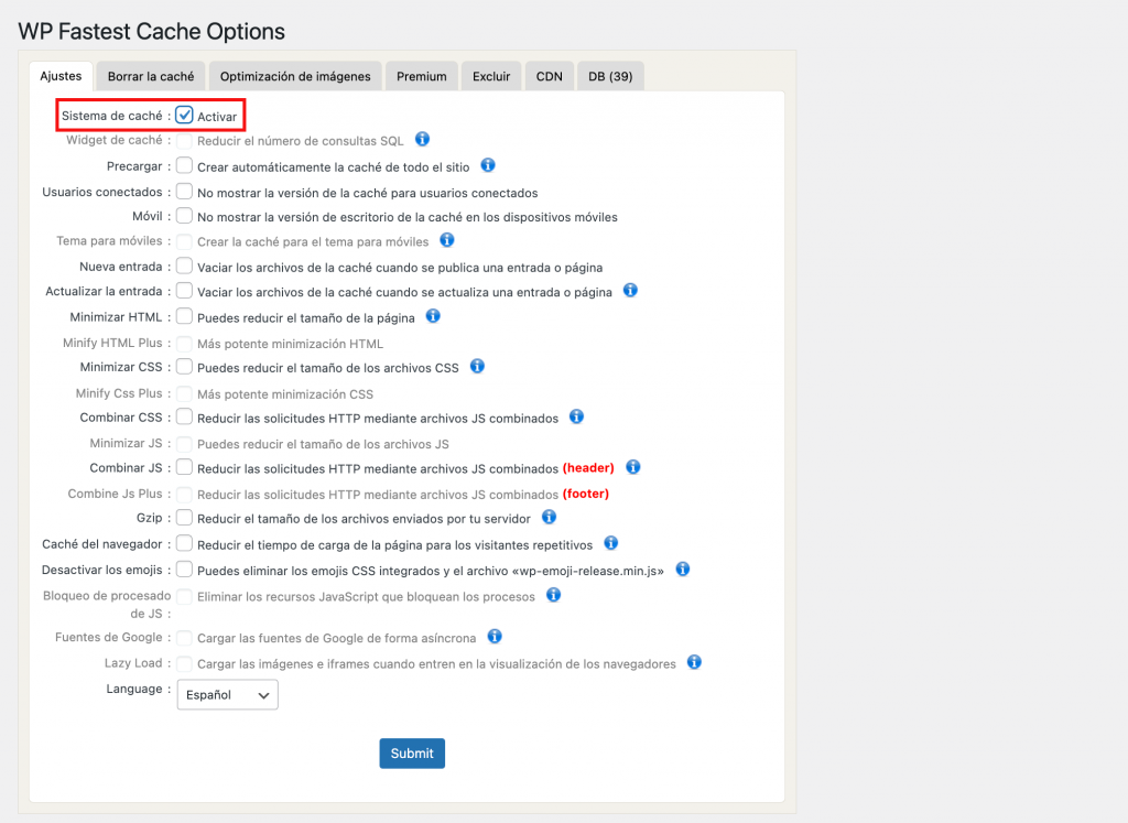 - Desde tu área de administración de WordPress, navega hasta WP Fastest Cache. Se abrirá la página de opciones de WP Fastest Cache.