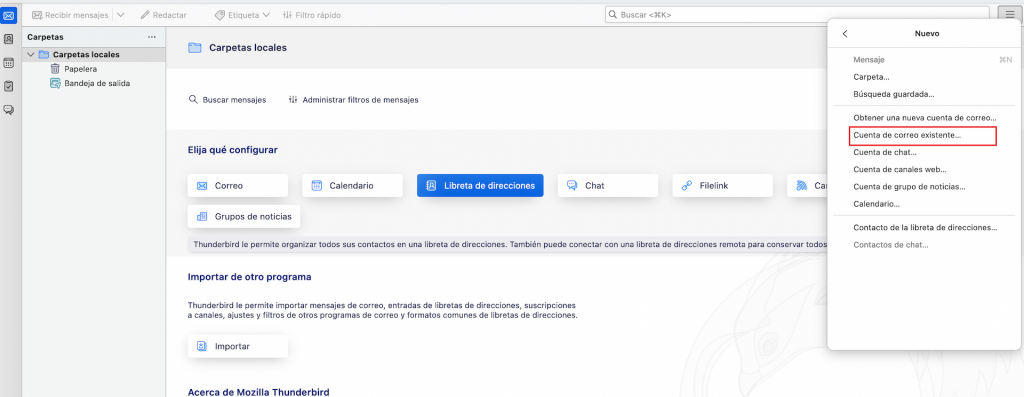 Para configurar manualmente una cuenta de correo en Thunderbird, abre la aplicación y haz clic en el botón del menú hamburguesa de la parte superior derecha de la ventana para acceder a esta página de configuración del cliente de correo electrónico. A continuación, haz clic en Nuevo -> Cuenta de correo existente.