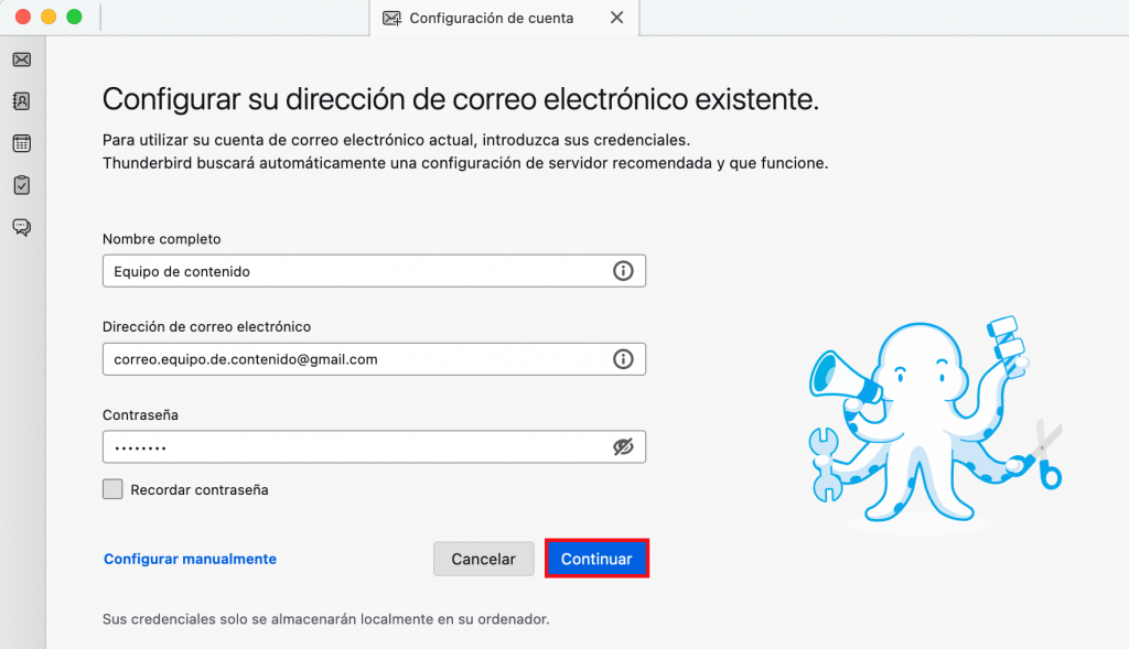 Para añadir una cuenta de Gmail o de un proveedor de email hosting importante similar a Thunderbird, sólo necesitarás la dirección de correo electrónico completa y la contraseña, ya que la plataforma puede determinar automáticamente sus ajustes de configuración del servidor de correo.