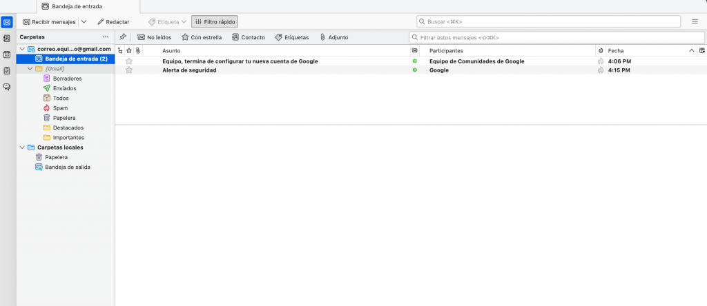 En la misma página, haz clic en Finalizar para ver tu buzón. Ahora, puedes empezar a utilizar Thunderbird para gestionar los correos electrónicos. La interfaz tiene el siguiente aspecto: