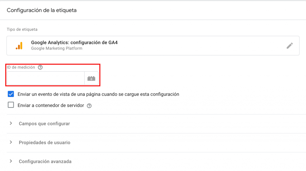 A diferencia de Universal Analytics, tendrás que introducir tu ID de medición en la configuración de la etiqueta. Para obtenerlo, configura primero un flujo de datos en la pestaña de Propiedades de tu Analytics.