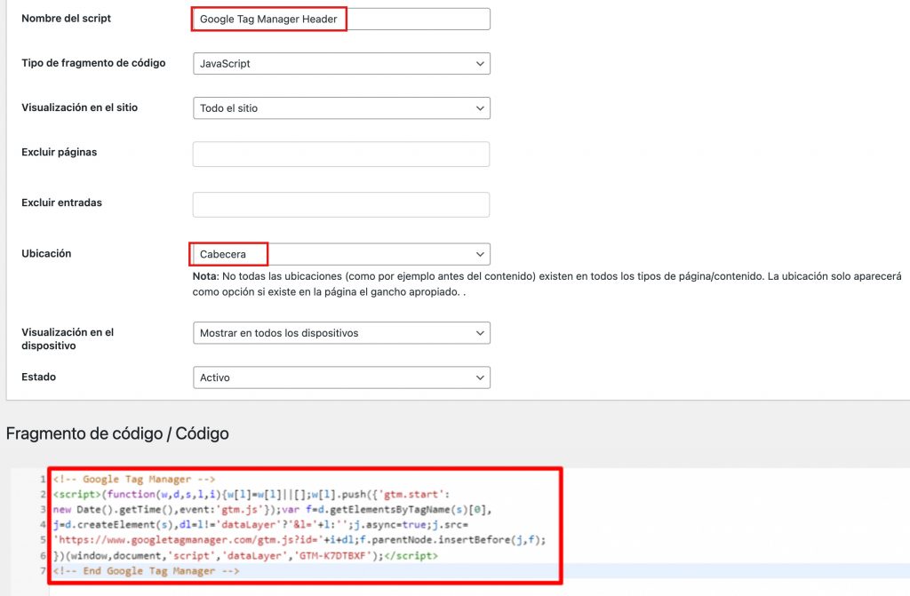 Introduce el nombre de tu snippet y pega tu snippet de Google Tag Manager. Por ejemplo, nómbralo “Google Tag Manager Header”. Elige Cabecera como ubicación, pega los fragmentos de código y haz clic en Guardar.