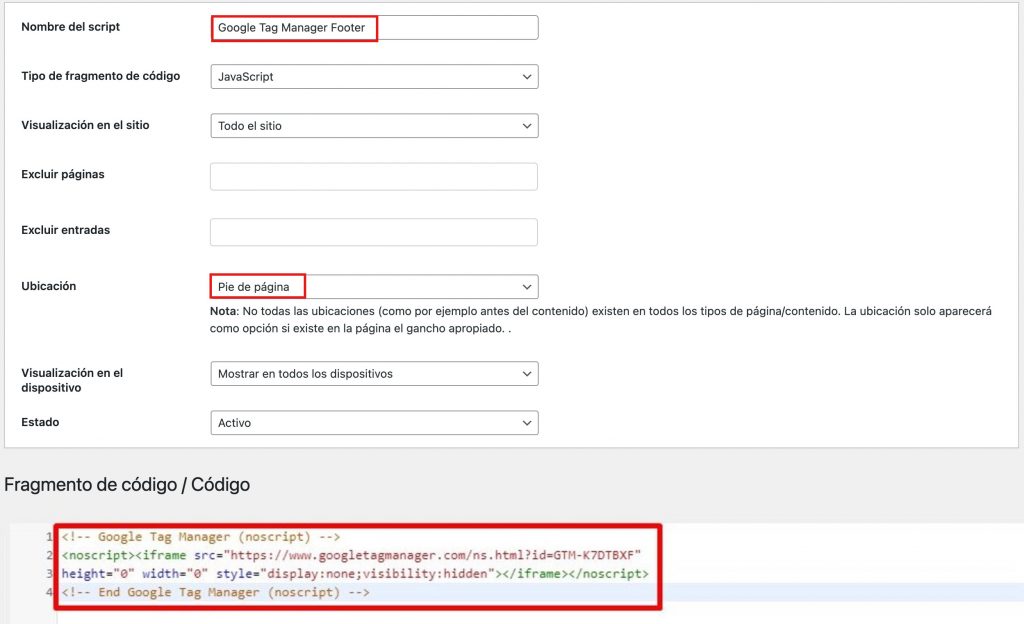 Crea otro fragmento para el pie de página. En este ejemplo, lo llamaremos “Google Tag Manager Footer”. Asegúrate de que la ubicación es el pie de página, pega el código de la etiqueta de apertura <body> y haz clic en Save.