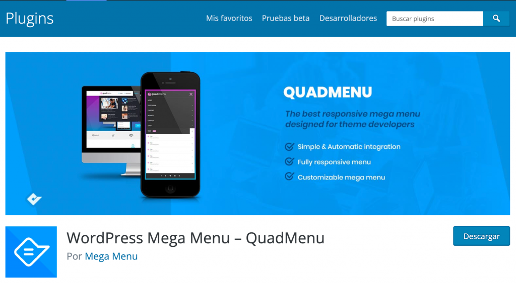 QuadMenu proporciona una integración rápida para ayudarte a crear varios tipos de menús en el tema de WordPress que utilizas. Este plugin de WordPress no cambia muchas cosas, pero puede mejorar la configuración predeterminada del menú en WordPress.
