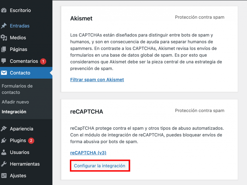 El plugin Contact Form 7 tiene la opción de integrar la protección reCAPTCHA en todos sus formularios. Para ello, dirígete al Escritorio -> Contacto -> Integración después de instalar y activar el plugin. En la sección reCAPTCHA, haz clic en el botón Configurar integración.