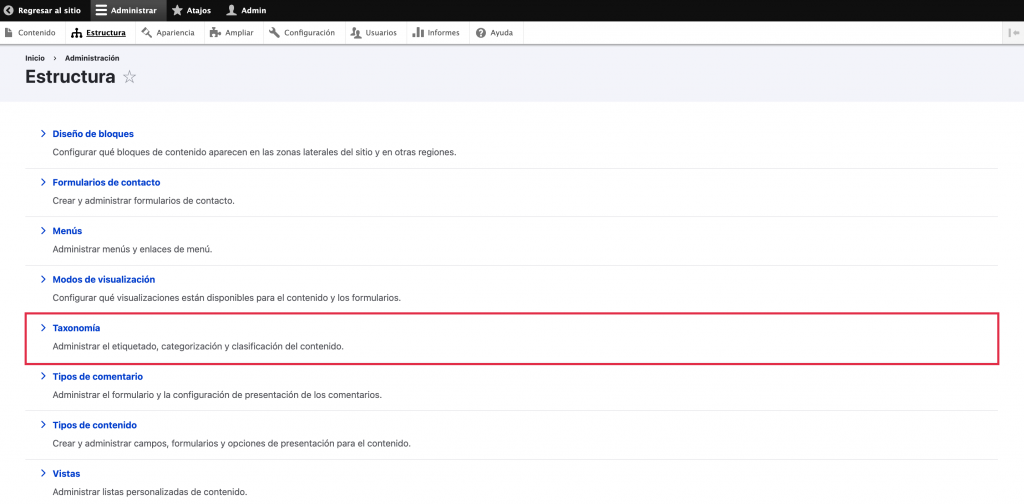 Una taxonomía se utiliza para clasificar el contenido del sitio web. En Drupal, las taxonomías se componen de entidades llamadas términos, que son palabras que describen un contenido específico dentro de los vocabularios. Un vocabulario puede tener una estructura plana o jerárquica según el tipo de contenido.