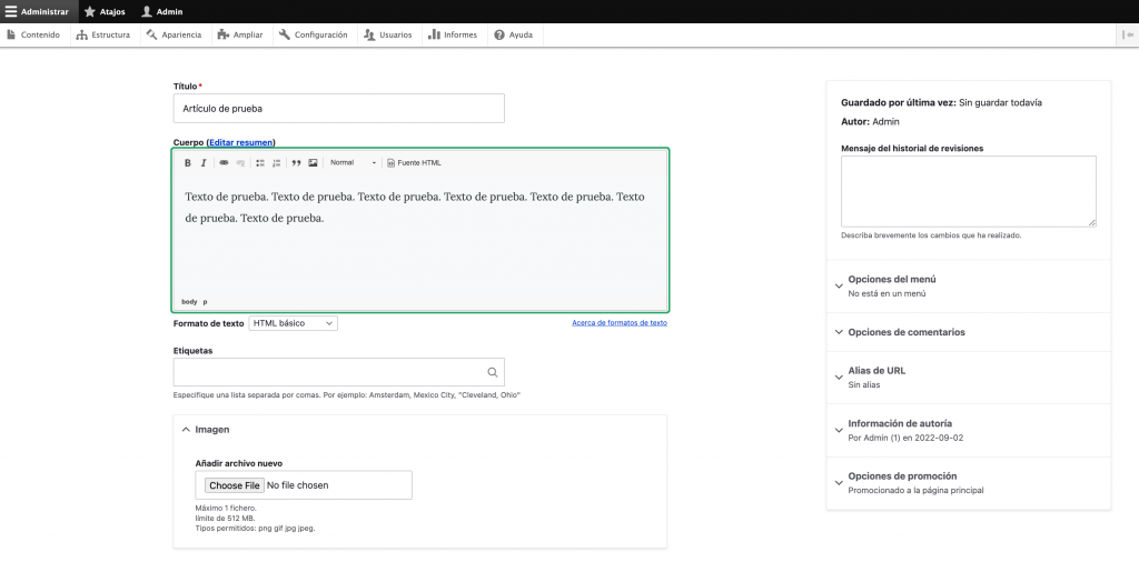 Drupal tiene dos tipos de contenido básicos: artículo y página básica.