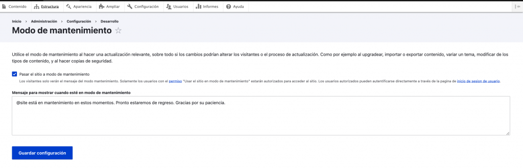En esta sección, repasaremos los pasos para actualizar Drupal. Antes de empezar, te recomendamos encarecidamente que cambies tu sitio al modo de mantenimiento. Al hacerlo, evitarás que los visitantes accedan al sitio durante el proceso de actualización.