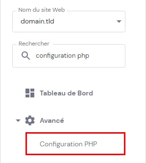 La version PHP de votre hébergement peut être modifiée à tout moment, pour ce faire, il suffit de passer à Sites web → Gérer, de rechercher Configuration PHP dans la barre latérale et de cliquer dessus :