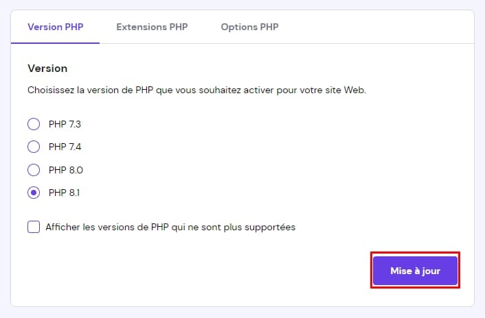 Changement de la version de PHP via le hPanel de Hostinger