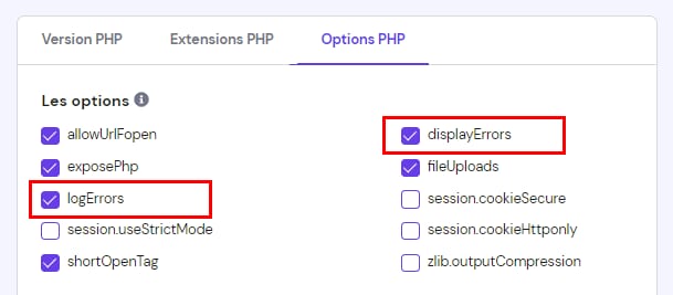 Une fois là, ouvrez la page des options PHP et décochez le paramètre displayErrors (display_errors). Si vous ne souhaitez pas que les erreurs soient enregistrées, décochez également le paramètre logErrors (log_errors) :