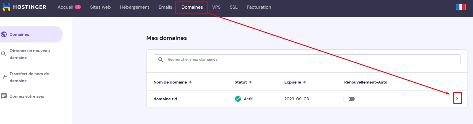 Pour tous les autres domaines, pour obtenir un code EPP ou un code Auth, il vous suffit d’accéder à votre onglet Domaines :