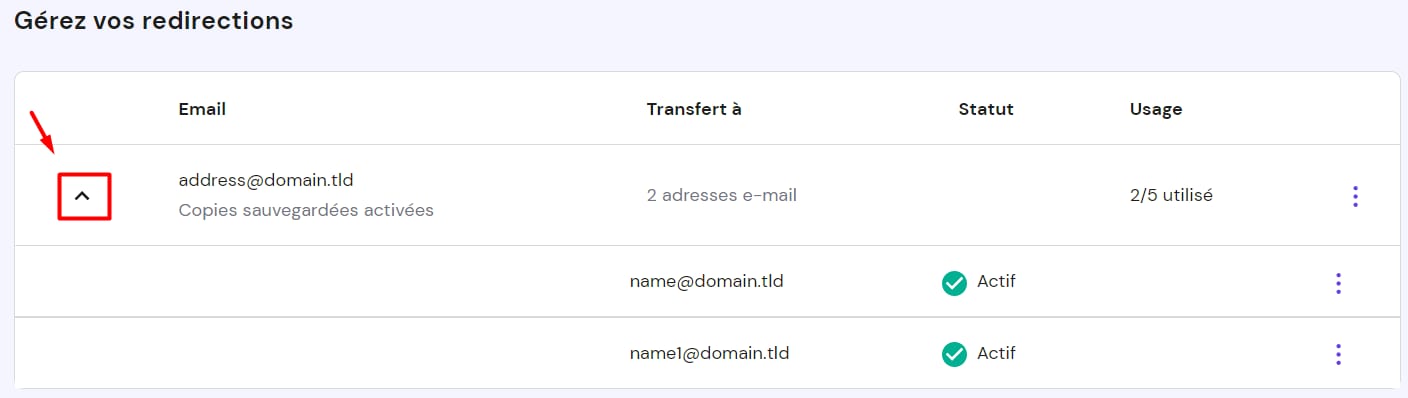 Vous verrez toutes les redirections déjà créées dans la section Gérer vos redirections. Si plusieurs redirections sont configurées pour certaines adresses email, vous les retrouverez toutes regroupées sous la flèche vers le bas :