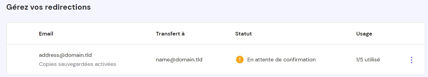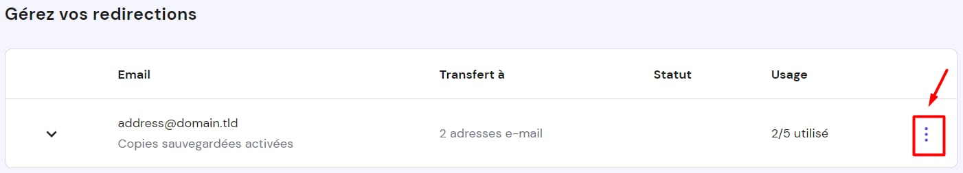 Pour gérer une redirection existante, il suffit de cliquer sur le bouton ⋮ en face du compte email d’origine :